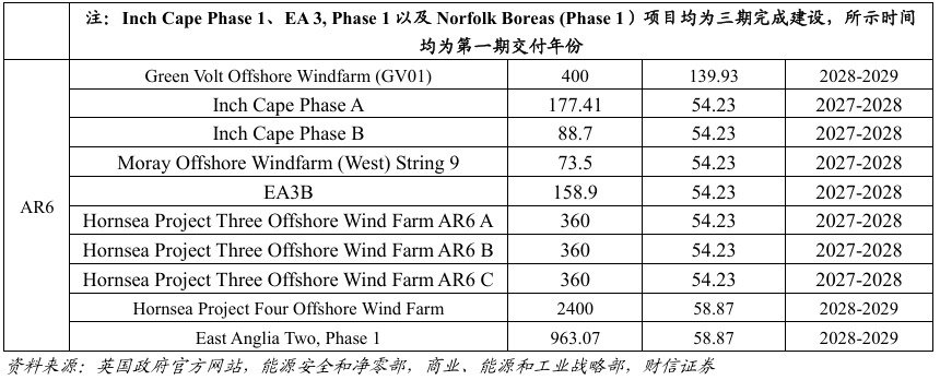 未来几年将有大量获得CfD机制扶持的项目陆续投产。据《英国海上风电报告2024》显示,截至2024年年底,英国海上风电项目共计45项在运、7项在建、获双边差价合约机制(CfD)支持待建6项。但我们对比在运海风和CfD机制中标海风项目可以发现,在运项目中仅有East Anglia ONE、Hornsea 2、Moray East、Seagreen Phase 1、Triton Knoll等五个项目合计约5GW来自CfD,占全部CfD拍卖获批海风总量22.19GW的约22.5%。前六轮CfD仍有约18GW的项目尚未实现装机,根据这些项目的进度,我们认为未来3年内英国有望迎来海风的并网高峰期。