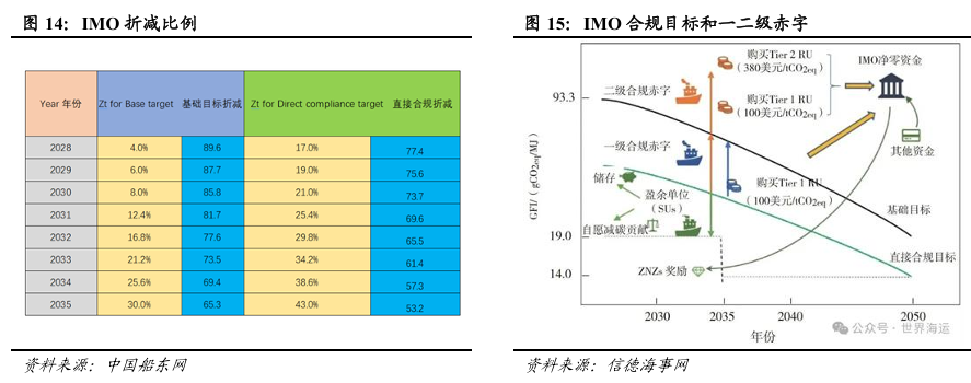 非电利用关注风电制绿醇在航运行业中的应用。风电制绿醇在航运中的应用主要得益于政策对航运业降碳的要求,主要是三大政策:1)欧盟碳关税法。将航运行业纳入欧盟碳排放交易体系(EU Emission Trading System,简称“EU ETS”),途经欧盟境内的船舶需缴纳100%碳配额,欧盟和非欧盟地区之间的航程需缴纳50%碳配额。2)欧盟《海运燃料条例》(FuelEU Maritime)。欧盟《海运燃料条例》(FuelEU Maritime)以“倒逼燃料结构转型”为核心目标,为航运业设定了极具挑战性的阶梯式碳减排路线图。该法规明确,以2020年船舶燃料碳强度为基准线,分阶段提出减排要求:2025年为2%,2030年提高到6%,2035年大幅攀升至14.5%,2040年、2045年分别达到31%、62%,最终在2050年实现80%的减排幅度。3)IMO净零框架 ( IMO Net-Zero Framework )。内容主要包括引入船舶年度温室气体燃料强度 ( GHG Fuel Intensity,GFI ),表示船舶使用的每单位能源全生命周期的温室气体排放量,以gCO2eq/MJ为单位。以2008年全球船队平均燃料温室气体强度93.3克二氧化碳当量/兆焦 ( gCO2eq/MJ ) 为基准值,设定2028年起逐年折减的基础目标和直接合规目标。2028-2035年折减率直接确定,2036-2040年折减率在2032年前确定,目标是2040年的基础目标折减率是基准值的65%。GFI低于直接合规目标,可以获得盈余单位(SU), SU可以储存两年或在市场交易,但不能用于抵扣一级赤字;GFI低于基准目标但高于直接合规目标的部分产生一级赤字,需购买一级补救单位 (Tier 1 RU);高于基准目标的部分产生二级赤字,需购买二级补救单位 (Tier 2 RU),或使用盈余单位 ( SU ) 抵扣。2028-2030年的Tier 1 RU价格为100美元/tCO2eq,Tier 2 RU价格为380美元/tCO2eq,2031年起的价格将在2028年1月前确定。
