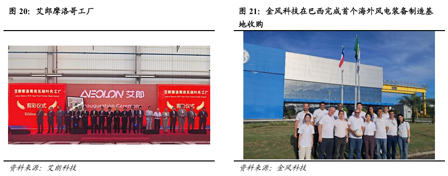 从产品出口到产能出海逐渐走出趋势。主机、塔筒和叶片等厂商开始在海外布局制造基地,实现本地化生产。1)明阳智能:2025年10月,公司公告拟在苏格兰建设英国首个全产业链一体化风电机组制造基地,预计投资总额为15亿英镑,折合人民币约为142.10亿元,将用于建设海上与漂浮式风电机组制造工厂。2)金风科技:2024年4月26日,金风科技完成金风首个海外风电装备制造基地——卡马萨里总装厂的收购。2024年8月27日,基地正式投运,投运后生产gwh182系列中速永磁机组,预计年产能达到150台。3)大金重工:根据公司2025年6月25日《关于筹划发行H股股票并在香港联合交易所有限公司上市相关事项的提示性公告》,公司拟赴港上市。根据公司2025年9月11日投资者关系活动记录表,公司计划将大部分 H 股上市募集资金投向海外总装基地建设以及深远海前沿产品的研发和建造,从而加强在欧洲市场本土化供应能力,以及深远海综合解决方案的升级。4)中材科技:2025年6月份公告,公司拟在乌兹别克斯坦新设中材科技(中亚)风电叶片有限公司(筹),投资2,524.34 万美元建设年产 110 套百米级风电叶片制造基地建设项目。5)中天科技:2025 年 8 月 12 日晚,公司公告拟以自有资金出资 8000 万美元(折合人民币约5.74亿元)在沙特投资设立一家全资子公司,主营业务包括海底电缆、OPGW、陆缆的生产制造及销售、海缆运维服务中心。管理团队本地化。2025年,明阳智能正式宣布一项关键人事任命:任命在国际能源领域拥有超过20年丰富经验的何瑞修为欧洲明阳首席执行官。加入明阳前,何瑞修曾任全球最大化工企业之一巴斯夫(BASF)全球能源业务负责人,全面管理巴斯夫的可再生能源电力组合,并负责在欧洲、中国和美国等地建设和拓展其全球可再生能源资产。