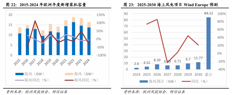 2024年欧洲海风装机放缓。根据欧洲风能协会的统计,2024年欧洲新增风电装机16.4GW,同比-23%。其中,陆风13.8GW,同比-6.12%;海风2.6GW,同比-29.73%。高达约100GW的海风招标已在陆续推动中。从招标端来看,截至2025年上半年欧洲多国已启动近100GW的海上风电招标计划,较2024年上半年13.2GW的招标规模大幅增长657.58%,凸显出欧洲海上风电未来巨大的增长空间。预计欧洲海风市场2026年开始提速。根据欧洲风能协会预测,2025年欧洲海风新增装机有望达4.52GW,较2024年同比+76.22%,并预计2026-2030年分别达到8.39GW、6.49GW、6.71GW、9.7GW和11.77GW,到2030年海风累计装机有望达到84.12GW。