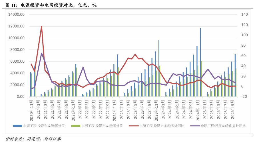 “十四五”侧重电源端的建设,但后期更加强调消纳。从“十四五”的数据来看,前期电源投资的增速明显快于电网投资增速,尤其是风光等新能源电源投资。但从2024年3月起,电网投资增速开始加快,电源投资增速逐步放缓,期间增速差最大为2025年2月,对应的电网投资增速为33.5%,电源投资增速为0.2%。根据沃太能源的报道,当新能源渗透率超30%时,电网频率耐受能力将下降40%。因此最近两年电力系统的重点也主要是从加快特高压建设、提高电网消纳,新能源配套储能,需求侧效应,加快电气化等多个方面来解决新能源的消纳问题,但基本逻辑还是以新能源的“电能”属性为主。