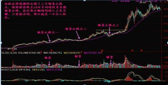 我们把5日、10日均线靠近60日均线称为“缩量止跌点”,在一个大牛股的滑跑过程中,有时会出现第一“缩量止跌点”,第二“缩量止跌点”,甚至第三第四“缩量止跌点”,这都是买入的机会。