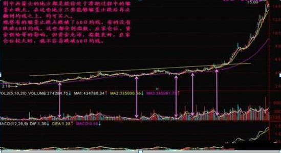 所以,当股价跌到60日平均线附近时,可以观察其成交量是否极其萎缩,股价能否在这里翘头向上,并发生金叉,如果是的话,这里是较好的买入点。