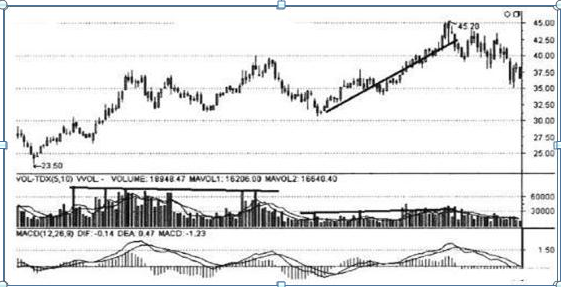 某些股票在底部出现明显放量后,开始在一个上升通道中震荡上行,随着股价运动到比较高的区域,成交量反而逐步缩小。这些股票的缩量,反映了这些股票的庄家通过在底部的吸货和洗盘,已经将筹码大量聚集在自己的手中,所以股价越是向上走,成交量就会越小。遇到此类股票,可在其上升通道中逢低吸纳,会有较大的收益。