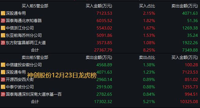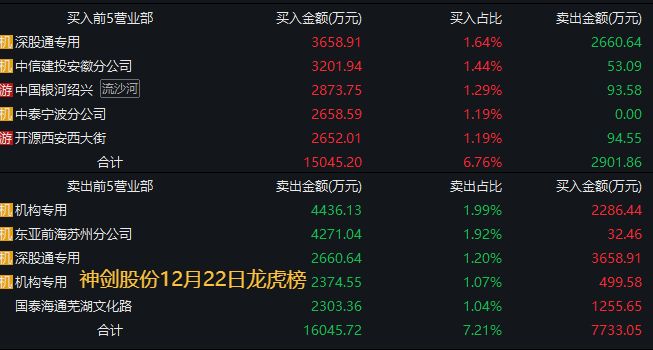 在本周的交易中,开源证券西安西大街操作的个股,都是流动性强的当前热门股,比如12月22日买入神剑股份2652万元,12月23日反手就卖出2960万元。从股价表现来看,神剑股份12月22日涨停,12月23日涨停,甚至之后的12月24日-26日股价都连续涨停。开源证券西安西大街错失了后面连续3个涨停板。