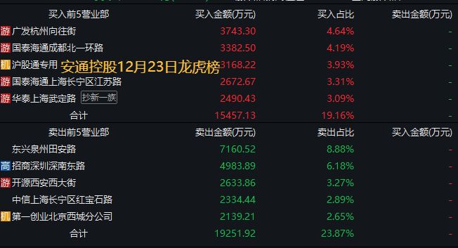 在本周的交易中,该席位在12月23日买入安通控股2672万元之后,当日安通控股涨停,12月24日-25日公司股价继续涨停。12月26日安通控股继续涨停,但是从12月26日的龙虎榜数据来看,国泰海通证券上海长宁区江苏路营业部还是没有现身卖出席位中。