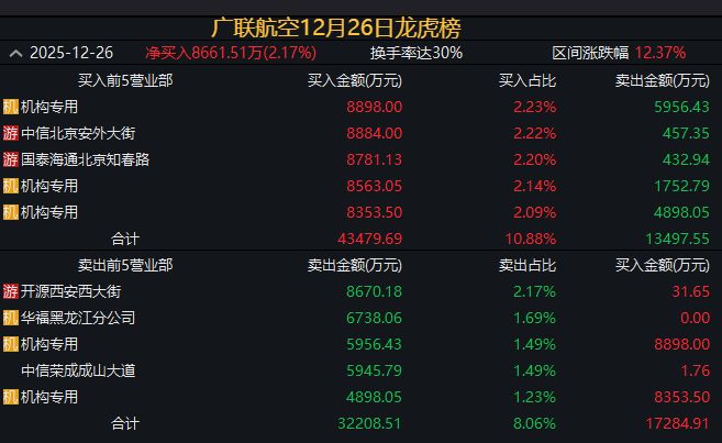 广联航空12月25日的龙虎榜数据显示,开源证券西安西大街买入7300万元,次日该席位卖出8670万元,很显然拿了一个涨停板的利润出局。