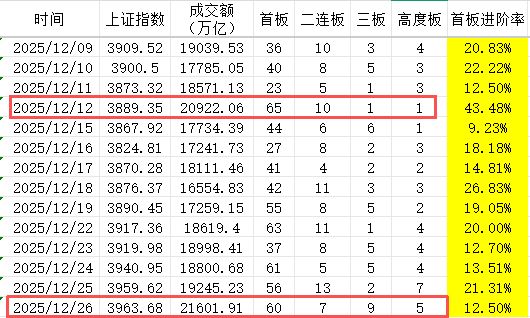 上一次市场成交额突破2万亿元是12月12日,当天的首板进阶率为43.48%,那是因为12月11日的首板公司只有23家,基数偏小导致首板进阶率偏大。