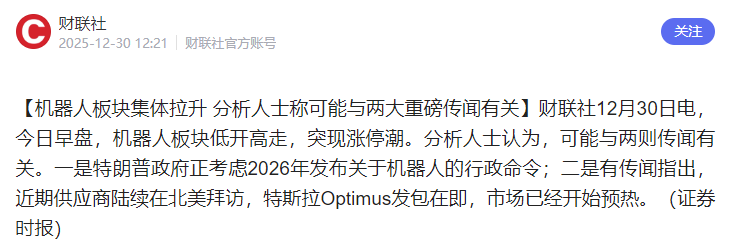 据证券时报报道,可能与两则传闻有关。一是特朗普政府正考虑2026年发布关于机器人的行政命令;二是有传闻指出,近期供应商陆续在北美拜访,特斯拉Optimus发包在即,市场已经开始预热。