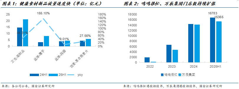 新品仍为核心驱动力,以高蛋白、低卡路里为特征的坚果、魔芋等健康食材持续成为创新焦点,精准契合当代消费者对健康与体态管理的核心诉求。分公司来看,盐津2025H1辣卤魔芋/蒟蒻/蛋类零食收入分别为7.91/4.28/3.09亿元,分别同比+155.1%/+9.01%/ +29.57%。卫龙2025H1菜制品收入21.09亿元,同比+44.3%。