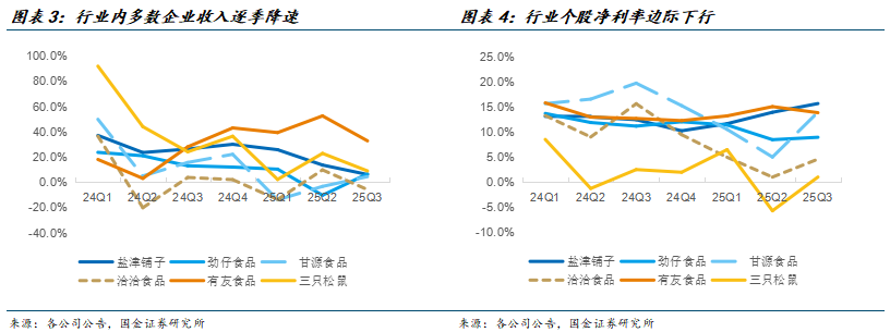 回顾零食板块季度收入表现,在高基数下呈现增速放缓趋势,且多数企业增速预期与年初原定目标存在差距。我们认为主要系:1)渠道红利行至后半程,如量贩零食目前逐步进入深度整合阶段,头部和中部品牌逐步分化,头部品牌表现强势。2)新渠道红利释放不均,直播电商、即时零售等成为增长亮点,2025上半年洽洽食品线上收入同比增幅超24%,甘源食品电商渠道增长12.4%,但部分企业受战略调整与价盘管控影响错失机遇。3)行业竞争更趋白热化,健康化、细分化成为破局关键,而传统企业适应滞后问题凸显,部分企业仍陷入低价与同质化竞争,在产品创新与渠道适配方面的反应速度制约了增长动能。