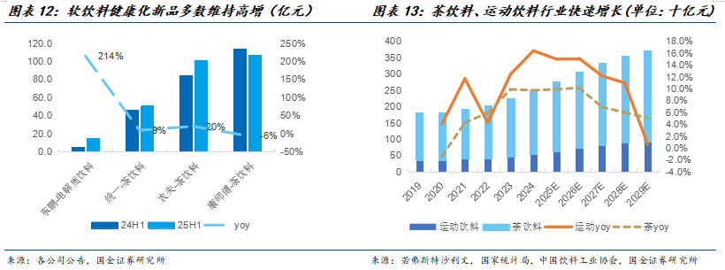 从新品类表现来看,软饮消费呈现出健康化、低糖化、低脂化升级趋势,如电解质水、无糖茶、椰子水等品类快速爆发,据若弗斯特沙利文数据显示,茶饮料自2021年开始恢复增长态势,并呈现加速增长态势,2022-2024年增速分别为5.9%/9.9%/9.7%。对应到农夫山泉/康师傅/统一企业中国2025H1茶饮料规模分别为100.9/106.7/50.7亿元,增速分别为20%/-6%/9%,其中无糖茶为增长核心驱动力。此外运动饮料受益于大众健康意识提升、户外运动等场景全面修复,自21年起开始快速增长,若弗斯特沙利文数据显示2020~2024年运动饮料赛道复合增速为11.1%。东鹏补水啦2025Q1-Q3共实现销售收入28.47亿元,同比+135%;单Q3销售加速,实现销售额13.54亿元,持续超预期。