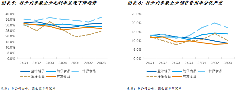 休闲食品行业成本端呈现分化态势,面粉、大豆等部分大宗商品价格延续回落趋势,为相关企业缓解了部分成本压力。但葵花籽、坚果等部分核心原料受供需或天气因素影响价格波动上涨,导致甘源、洽洽等单一原料占比较高的企业,毛利率阶段性承压。同时,行业竞争白热化叠加渠道结构迭代,企业为抢占新渠道份额或应对价格战,主动下调产品均价或承担更高渠道费用,抵消了大宗商品降价带来的部分成本红利,最终导致行业整体毛利率小幅下降。