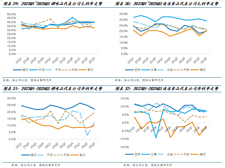 基础调味品方面,呈现龙头强者恒强态势,如今年前三季度海天稳定在10%左右的收入增速;而中炬和千禾表现疲软,前三季度收入分别下降20%/13%。其中分化的主要原因在于,1)海天作为龙头经营韧性强,内部改革效果快速兑现,对外对接新渠道研发新品夺取存量,对内精益生产提升效率,持续提升市场份额。2)政策趋于严格,居民升级速度放缓,其中自2025年3月开始零添加标识使用受限后,新规一方面整肃行业乱象行为,同时也牵制零添加行业增速。
