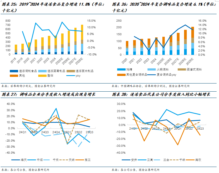 速冻食品方面,2025年在需求偏弱的背景下行业竞争持续强化,价格战呈现较为明显,同期企业费用投放出现明显增加,行业龙头利润增速放缓至个位数甚至开始下滑。安井自2025Q3报表端开始企稳修复,渠道反馈10-11月数据亦维持良好的修复态势,我们认为主要系餐饮终端动销开始改善,另外渠道针对旺季补库存意愿增强,安井作为龙头持续巩固经销渠道优势,配合较强的成本管控能力,持续拓展业务版图提升市场份额。