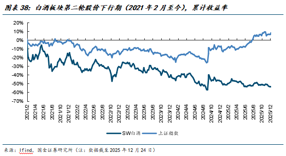 通过复盘2025年白酒板块行情,核心仍以基本面预期交易为主。年内板块α机会为2月交易春节动销反馈、即春节动销录得低预期下略超预期的表现,但与2024年相似、今年节后动销反馈同样转淡,在此基础上叠加5月18日中共中央、国务院印发修订后《党政机关厉行节约反对浪费条例》,基于消费场景约束超预期地对白酒行业需求产生影响。至中秋&国庆双节,渠道反馈已印证禁酒令等外部风险事件对白酒消费场景的约束有环比改善迹象,同期上市酒企报表录得加速出清,自此市场对白酒基本面预期逐步企稳,白酒板块相对收益未再单边下行。