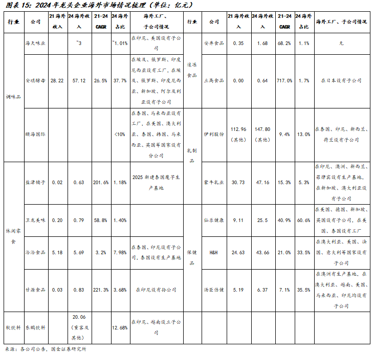 从目前出海占比较高的企业来看,具备以下三个特征,1)偏制造企业出海相对容易,如酵母此类重资产、市场份额高度集中的行业,大企业出海具备较强的资本、规模优势,销售性价比、服务效率等维度对当地的小企业形成降维打击。2)具备海外产能的企业销售额增长较快,一方面可灵活根据当地市场需求定制化产品,另一方面工厂是品牌形象宣传的窗口。如洽洽食品早期在泰国设厂,目前是零食行业中海外占比最大的企业。3)品类属性维度,产品越刚需则代表出海空间越大,且能较好克服文化饮食背景差异。如酵母、酱油、奶粉等产品,属于刚需属性较强的品类,并不需要额外的消费者教育成本。