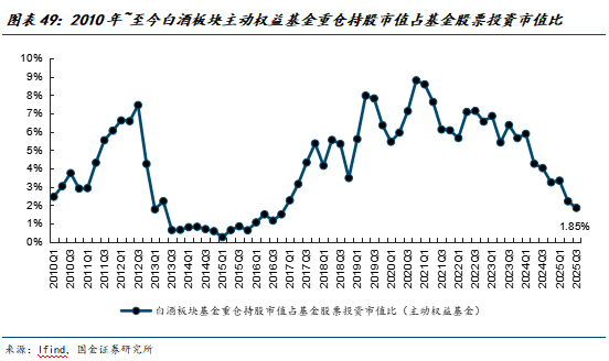 和行业景气度相匹配的是,白酒板块基金持仓已经降至低位。其中,主动权益基金整体持仓在2025Q3末时已回落至1.85%,预计2025Q4环比仍有所回落。
