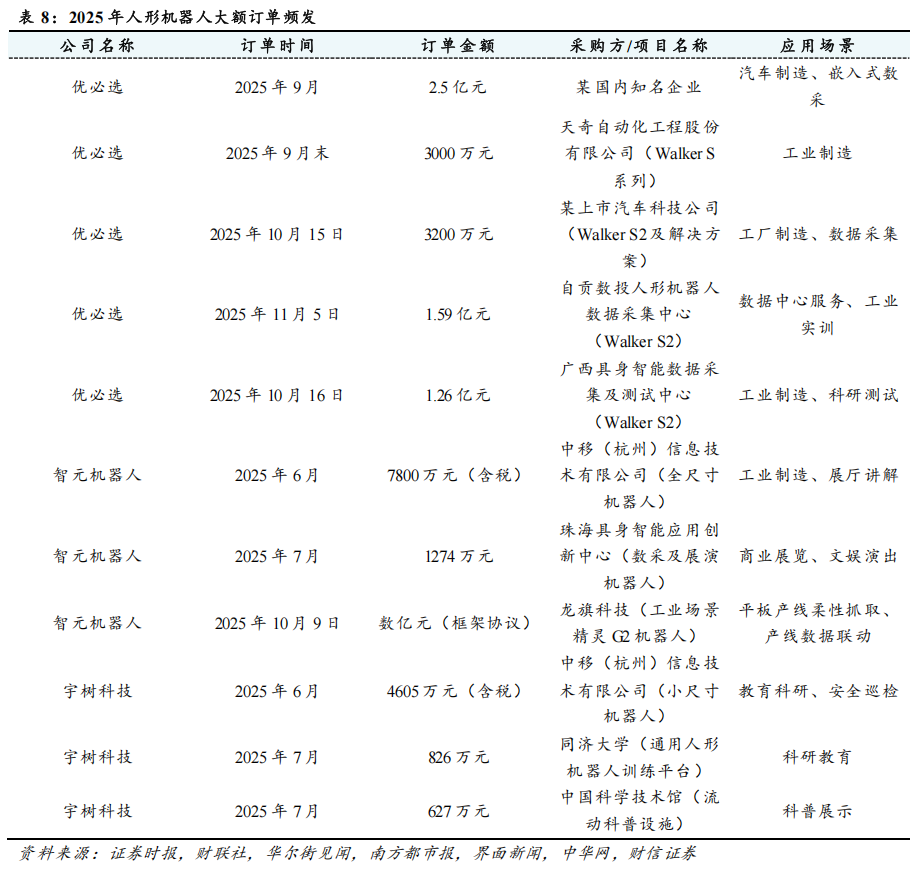 今年以来国内人形机器人订单频发,大额订单合计超7亿。2025年以来,国内人形机器人整机厂商大额订单频发,优必选、智元机器人等均获得了数亿元订单,应用场景均以工业制造为主,而宇树科技的机器人产品定位主要偏向家庭和科研,因此大额订单较少,但业绩表现仍然优秀。
