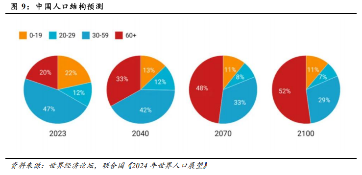 我国老年人口规模庞大,且尚处于高速增长态势。我国自2000年迈入老龄化社会之后,人口老龄化程度持续加深。根据民政部、全国老龄办发布的《2023年度国家老龄事业发展公报》,2023年中国60岁及以上人口29697万人,占全国人口的21.1%。根据联合国2024年人口展望测算,如果出生率等大背景没有明显改变,中国60岁以上人口在2040年就会达到33%,到2070年则会达到48%,而30-59岁的青壮年人口则会从2023年的47%下降至2040年的42%,到2070年则会进一步下降至33%。届时会出现明显的劳动人口短缺及老年人养护问题。