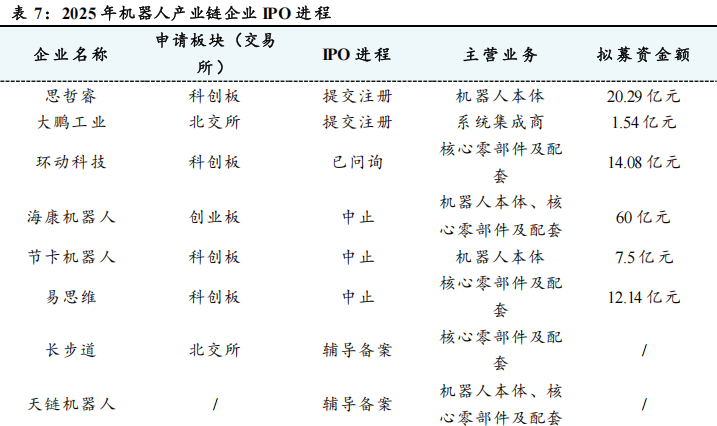 国内外厂商共同推进机器人产业化进程。海外发达国家在人形机器人领域探索较早,积累深厚,头部企业如特斯拉、Figure AI和波士顿动力在运动控制、AI集成方面领先。特斯拉计划2026年实现5万-10万台量产,Figure 03专为规模化生产设计;国内政策强力护航,《人形机器人创新发展指导意见》等文件明确2025年初步建立创新体系,宇树科技、智元机器人等企业已在整机研发和场景落地取得突破,2025年以来大额订单累计超7亿元。资本市场活跃,多家机器人产业链企业冲刺IPO,投融资规模持续增长,北京、深圳等地通过千亿级基金支持技术攻关。