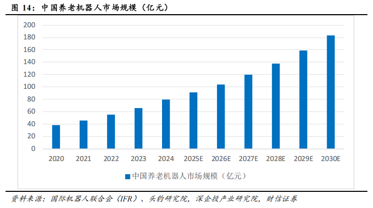 预计到2030年中国养老机器人市场规模将达183亿元。根据国际机器人联合会(IFR)的数据,2020年中国养老机器人市场规模约为38亿元。到2023年,随着服务机器人市场的整体增长,养老机器人市场规模也相应扩大,据世界机器人大会披露的数据及相关占比核算,2023年中国养老机器人市场规模约66亿元。随着人工智能、5G通信技术、云计算、大数据等信息技术的发展,传感器、伺服电机、AI芯片、减速器等核心部件的成熟,养老机器人在智能照护领域正从“功能实现”向“体验优化”转型。预计到2030年中国养老机器人市场规模将达183亿元。