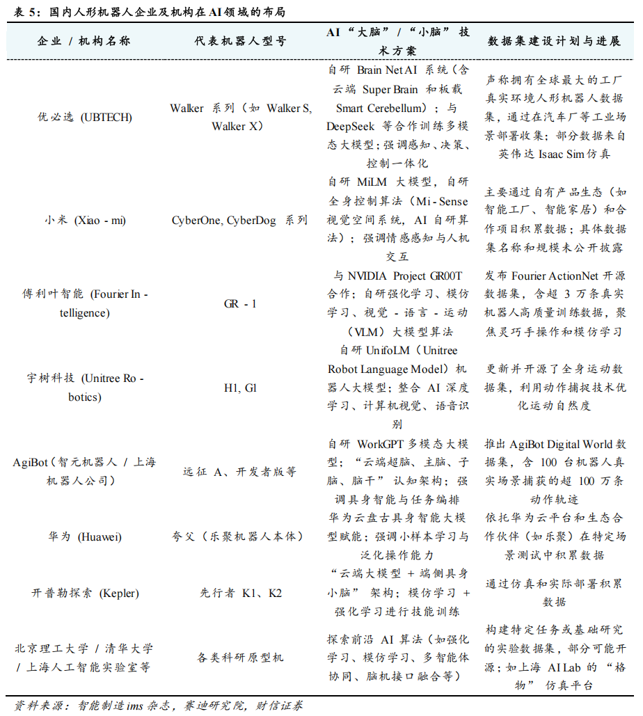 我国在人形机器人的“大脑”研发方面,已经取得了显著进展。优必选自研BrainNet AI系统,整合云端与板端算力并联合外部优化模型,覆盖感知、决策、控制全环节;小米打造MiLM大模型与Mi - Sense视觉算法,锚定情感感知与人机交互;傅利叶智能携手NVIDIA推进强化学习、模仿学习等技术,聚焦灵巧操作与任务执行;众多企业通过自研核心技术栈,在多模态感知、智能决策等领域构建差异化AI能力,部分还借力行业巨头(如NVIDIA)实现技术互补,夯实机器人“大脑”与“小脑”的智能底座。