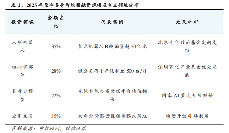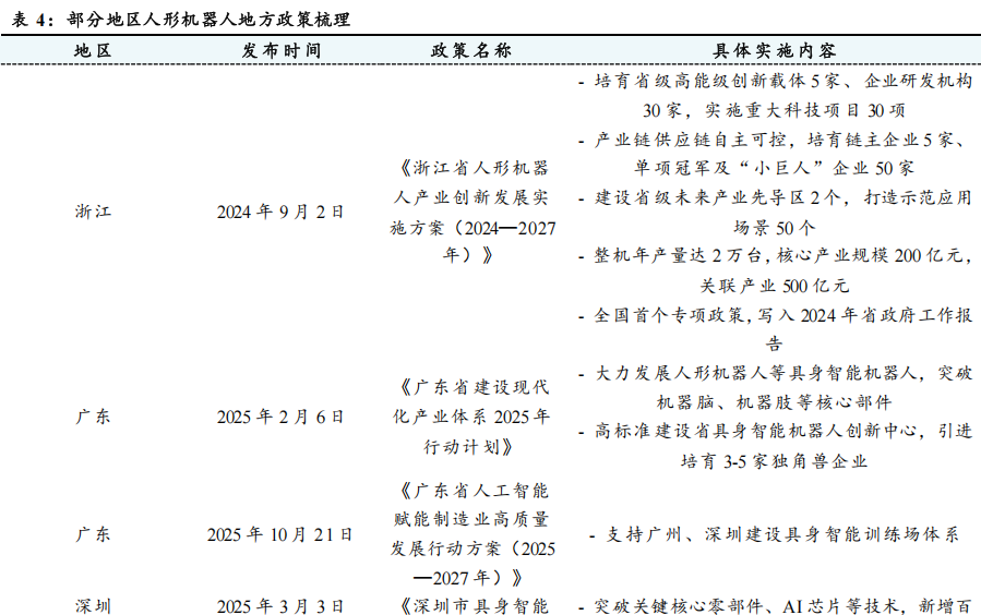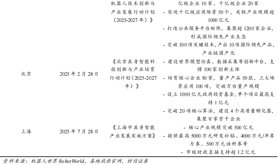 除上述地区之外,《江苏省机器人产业创新发展行动方案》、《山东省人工智能产业创新发展规划(2025-2027 年)》、《河南省“人工智能+制造”行动方案(2025-2027 年)》、《广西“人工智能+制造”行动方案(2025-2027 年)》、《辽宁省人工智能产业发展行动计划(2025-2027 年)》、《安徽省人工智能产业发展规划(2025-2027 年)》、《重庆市具身智能机器人技术创新与产业发展行动计划(2025-2027 年)》、《天津市人工智能产业创新发展实施方案(2025-2027 年)》等纷纷发布,各地政府均对具身智能领域高度重视,大力支持。总体上,已经明确金额数量的财政投入包括:北京约为1亿元、上海约1.1亿元、重庆10亿元、合肥高新区3年1.8亿元(1000万+5000万/年×3)、杭州约5000万元、宁波最高1.1亿元,合计约26.5亿元。而深圳、广州、天津等地通过产业基金或场景开放间接支持。