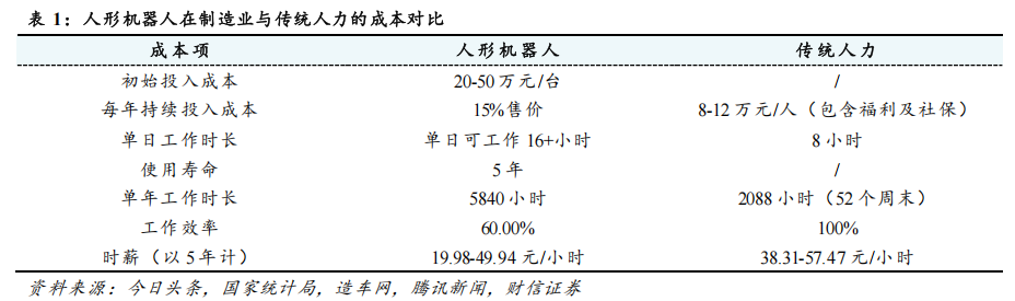 劳动力缺口的扩大会给予具身智能充足的应用场景,人形机器人在未来将逐步增强经济性。根据国家统计局数据,2024年制造业生产制造的相关人员的平均年收入为76940元,因此我们假设传统制造业工人的每年用人成本为8-12万元。根据腾讯新闻、今日头条、造车网的资料显示当下进入工厂从事作业的机器人初始投入成本差异较大,我们假设为20-50万元,运维成本假设为售价的15%,使用寿命假设为5年,今日头条访谈内容称人形机器人可单日工作小时为16小时。由于人形机器人尚处于早期发展阶段,我们假设其工作效率为传统人力的60%。则最后得出当下人形机器人进入制造业作业的时薪为19.98-49.94元/小时,而传统人力则为38.31-57.47元/小时,人形机器人已经具备理论上的优势。我们认为,人形机器人的高成本并不会一直持续,在成本下降之后,相对于传统人力在工业领域会具备显著优势。