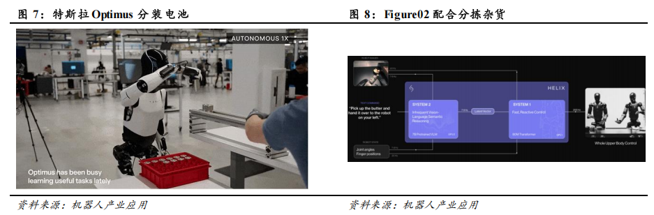 工业场景的应用已经逐步到来,大模型为人形机器人带来不可替代性。自2024年4月起,Optimus已在特斯拉旗下电池工厂开始作业,主要负责4680型电池单体的分类与托盘插入工作。在演示中,它能与自动化设备配合,将电池精准抓取并整齐摆放在料箱中,展现出适配工业节拍的高效性。Figure系列机器人搭载Helix大模型,在零样本学习与柔性操作上表现突出。Figure02已能在无预先训练的情况下,成功抓取数千件新物品,包括玻璃制品、纺织品等易损或柔软的“难处理品”。Figure02展示了“共享大脑”的协作能力:两台机器人配合分拣陌生杂货,无需预先编程即可完成分类摆放,实现了工业机器人几乎不可能做到的行为。