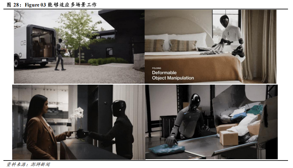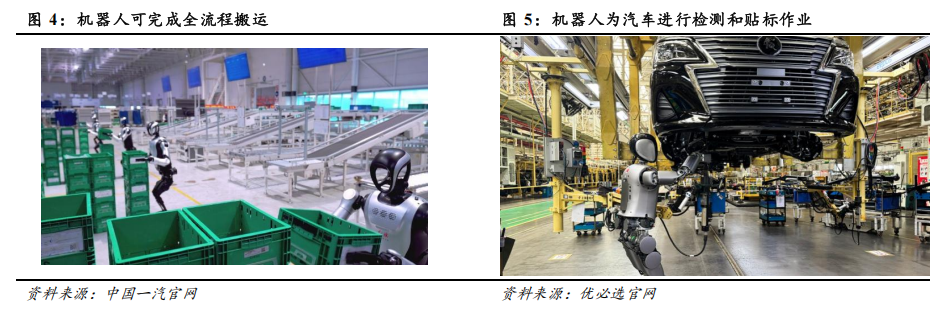 北美人形机器人已率先应用于汽车工业,物流等行业。的以北美为例,Figure 02应用于宝马汽车工厂,特斯拉Optimus应用于自家特斯拉汽车工厂,Apollo在亚马逊、GXO等物流中心和奔驰工厂均有应用。且北美机器人巨头产品均有自主行走、自主导航等功能,且能处理抓取、拼接、组装小零部件等较为复杂的业务。我们认为人形机器人与传统机械臂、工业机器人等功能具备较大差异,且在未来逐步发展后将会具备更大优势,值得期待。