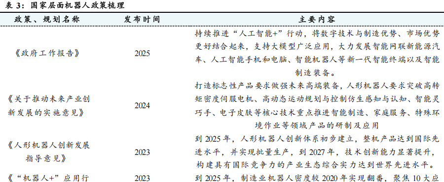 近年持续发布人形机器人相关政策,足见政府重视程度。早在2021年底,工信部、发改委等十五个部委、总局机构,联合发布《“十四五”机器人产业发展规划》,将具身智能列为重点突破方向。2023年11月《人形机器人创新发展指导意见》发布,该政策推出的目的为推动人形机器人产业高质量发展,培育形成新质生产力。文件中指出,到2025年,人形机器人创新体系初步建立,“大脑、小脑、肢体”等一批关键技术取得突破,确保核心部组件安全有效供给。整机产品达到国际先进水平,并实现批量生产,在特种、制造、民生服务等场景得到示范应用,探索形成有效的治理机制和手段。培育2-3家有全球影响力的生态型企业和一批专精特新中小企业,打造2-3个产业发展集聚区,孕育开拓一批新业务、新模式、新业态。到2027年,人形机器人技术创新能力显著提升,形成安全可靠的产业链供应链体系,构建具有国际竞争力的产业生态,综合实力达到世界先进水平。产业加速实现规模化发展,应用场景更加丰富,相关产品深度融入实体经济,成为重要的经济增长新引擎。2025年中国政府又将具身智能写入《政府工作报告》:“建立未来产业投入增长机制,培育生物制造、量子科技、具身智能、6G等未来产业”。行业的良性发展离不开政府的支持,中国政府对具身智能的高重视程度,将促进行业持续向好发展。
