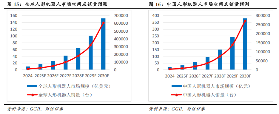 全球人形机器人行业目前处于技术探索的早期阶段,但后续潜力巨大。根据GGII的数据,2024年全球人形机器人市场规模达到10.17亿美元,预计到2030年将增长至150亿美元,2024-2030年间的复合年均增长率(CAGR)将超过56%,全球人形机器人销量将从1.19万台增长至60.57万台。
