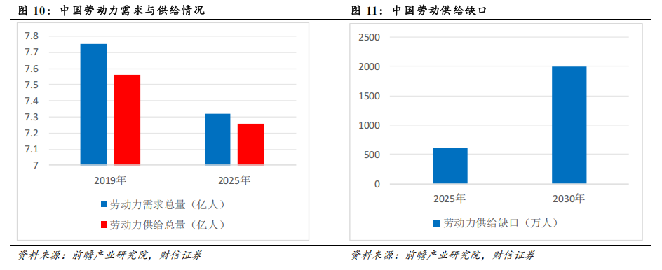 在当下背景下,预计未来中国劳动力缺口将逐步增大。根据前瞻产业研究院数据,2025年国内劳动力缺口为600万人左右,而在2030年将逐步增长至2000万人,劳动力缺口逐步增大,给予人形机器人较好的落地环境。