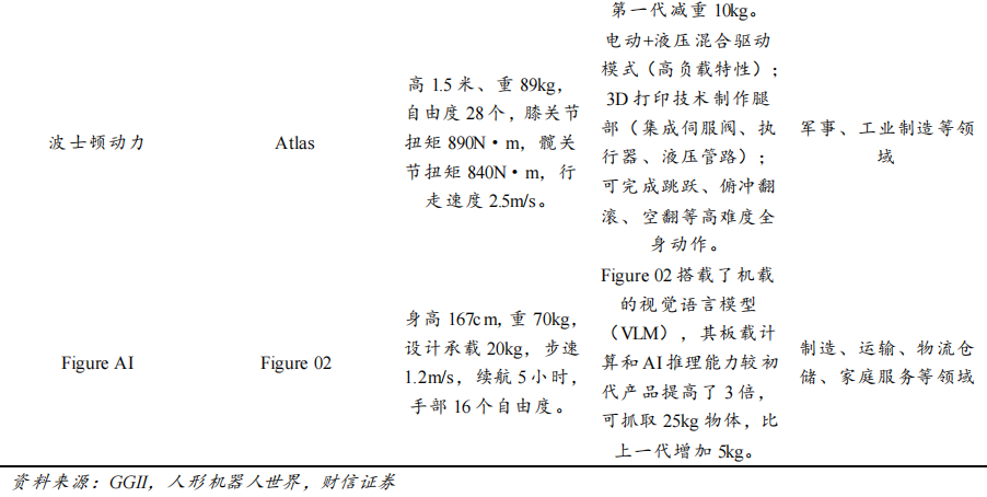 FigureAI公司系列人形机器人。2023年3月14日,FigureAI发布的人形机器人Figure01,利用OpenAI的大型语言模型,可以与人类进行正常的完整对话,并具备分类识别物品的能力,被认为是世界上第一个具有商业可行性的自主型人形机器人。2024年8月6日FigureAI发布的新一代产品Figure02,与上一代相比,FigureAI拥有16个自由度的第四代机械手,负载能力与人类水平相当,可以抓取25公斤的物体,比上一代增加5公斤。同时,Figure02的机载计算和AI推理能力提高了3倍,能够完全自主地在现实世界中执行任务。