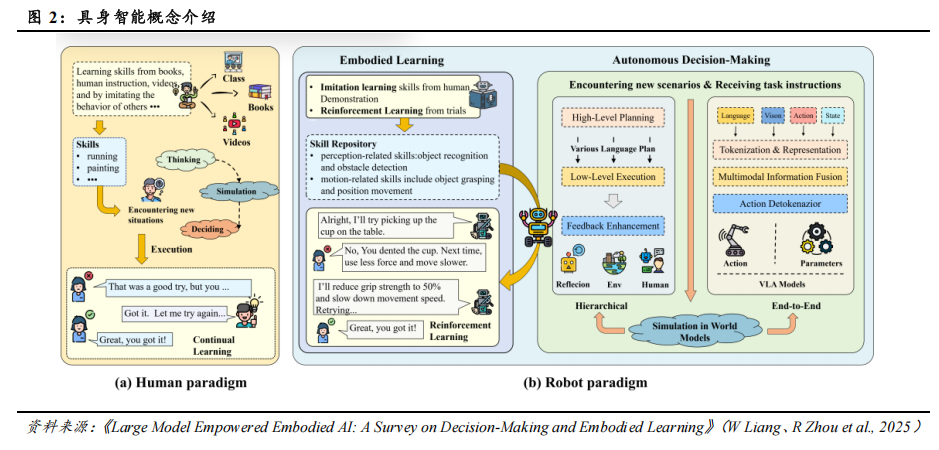 具身智能的实现依赖于“大脑”与“身体”的双轨突破。在“大脑”层面,大模型(如GPT、多模态模型)通过海量数据训练,具备跨模态理解、知识迁移和上下文学习能力,能够将自然语言指令转化为具体行动策略。例如,当用户说“递给我桌上的苹果”,大模型需解析“苹果”的视觉特征、“递”的空间关系,并规划抓取路径。在“身体”层面,硬件技术需突破运动控制、环境适应等瓶颈,如一体化关节、柔性材料、高精度传感器等。两者的结合使机器人从“预设程序工具”升级为“自主学习体”,例如通过强化学习在虚拟环境中模拟任务,再将经验迁移至真实世界。