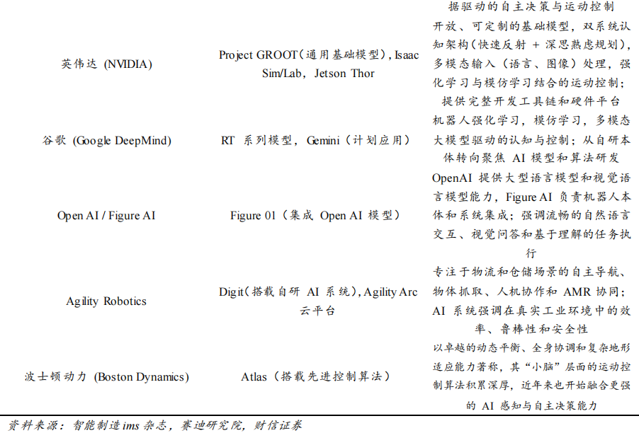 国外科技巨头在核心算力上投入巨大,通过自主研发高性能芯片和优化计算架构,为人形机器人提供强大计算支持。特斯拉的 Optimus 计划整合自研自动驾驶神经网络和 Dojo 超算,赋予机器人强大的感知、识别和任务规划能力,目标是执行日常任务。英伟达通过 Isaac 平台和强大算力,支持开发者构建能处理多模态信息的复杂模型,提升决策和学习能力。谷歌探索将大型语言模型(LLM)与机器人控制结合,如 RT-2 项目,让机器人理解抽象指令和物理概念,实现更灵活的交互,推动认知和交互层面的进化。另外还有英伟达的Jetson和DGX系统、谷歌的TPU等各类自研芯片和系统。算力基础支撑了AI模型的运行和实时运动控制,是人形机器人智能化提升的“引擎”。国外积极布局软件平台,通过开源生态与专有平台相结合的策略,构建丰富多样的软件生态系统。软件是连接硬件与智能的桥梁,是人形机器人发挥“大脑”和“小脑”功能的关键载体。开源机器人操作系统ROS(Robot Operating System)及其后续版本ROS 2,仍然是全球范围内机器人研发,包括人形机器人领域的重要基础。随着人形机器人对AI集成、云边协同、特定任务优化的需求日益增长,英伟达、波士顿动力等各大领先企业也在积极构建自身或基于合作伙伴的专有AI平台和开发工具链。同时,云平台的应用日益广泛。开源与专有平台并存、协同发展的局面,既保留了开放社区的创新活力,又满足了领先企业对性能、安全性和商业壁垒的需求,共同推动着人形机器人软件生态的繁荣。