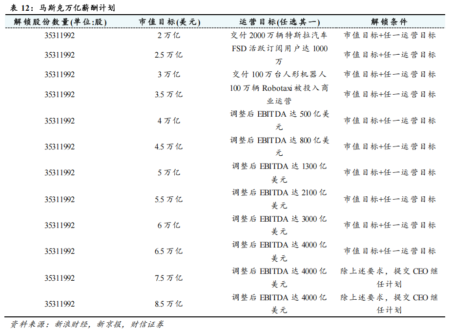 马斯克万亿薪酬计划中对人形机器人出货量有明确要求。据特斯拉2025年9月发布的《股东薪酬提案说明书》及SEC披露文件显示,马斯克需在10年间分12个阶段解锁4.237亿股限制性股票,按当前股价测算潜在价值约1万亿美元,解锁条件涵盖“市值阶梯”与“运营指标”两类。其中市值目标从第一阶段的2万亿美元逐步递增至第十二阶段的8.5万亿美元,每个阶段需维持30个交易日市值不低于目标值;运营指标则包括累计交付2000万辆汽车、FSD活跃订阅用户达1000万(连续三个月日均)、累计交付100万台人形机器人(自2025年9月3日起计算)、100万辆Robotaxi投入商业化运营(连续三个月日均),以及年度调整后EBITDA达4000亿美元(连续4个季度完成)等。