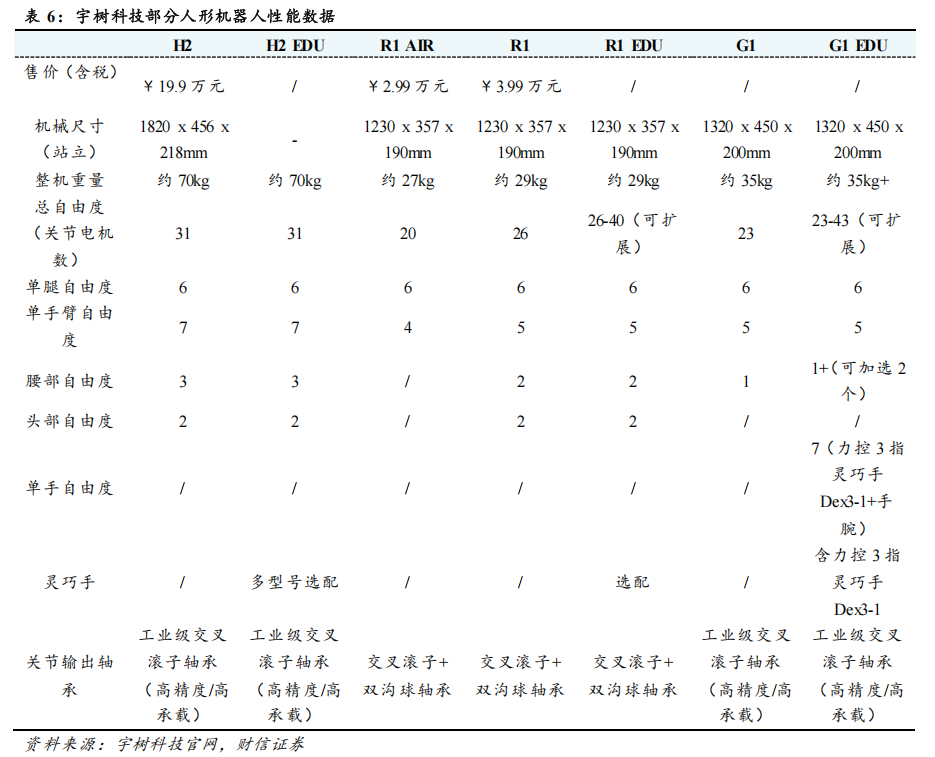 整机产品持续推出,覆盖各类应用场景。10月20日,宇树科技发布全新一代仿生机器人Unitree H2。据官方演示视频,该机器人整体形态更接近真人形态,并具备舞蹈、功夫表演等运动控制能力,亦可身着服饰扮演模特走秀。据悉,这款机器人配备了 31个关节,具体分布为肩部6×2(双臂各6个)、躯干3个、腿部7×2(双腿各7个),另含2个未知功能关节。相比宇树科技此前发布的R1机型的26个关节,关节数量提升19%,灵活性显著增强。宇树科技此前已推出R1、H1、G1三款人形机器人。其中R1 7月25日发布,身高1.2米左右,目前还未量产。H1则是登上2025年央视春晚表演的人形机器人,该款机器人发布于2023年8月,是宇树科技发布的国内第一台能跑的全尺寸通用人形机器人。G1发布于2024年5月13日,是2024年宇树科技发布的第二款人形机器人。定价方面,R1定价为3.99万元起,G1定价9.9万元,H1的定价则为65万元。