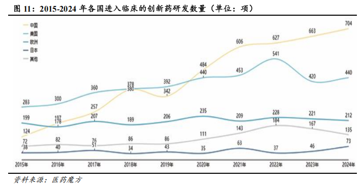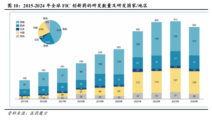 中国创新药研发数量明显增多,创新质量显著提高。2015-2024年,在政策支持、资本助力以及企业加大研发的推动下,中国企业自主研发的创新药数量呈现快速增长趋势。按历年首次进入临床试验的创新药进行统计,截至2024年12月31日,中国企业研发的活跃状态创新药数量累计已达3575个,超越美国成为全球首位。自2020年以来,中国每年新进入临床阶段的创新药数量均多于美国。其中,2024年,中国有704项创新药管线进入临床阶段,远多于美国的440项。从在研管线的创新程度来看,2015-2024年,中国处于同类首创(First-in-Class,FIC)的创新药管线数量由9项增长至120项,占全球FIC的创新药管线比重由不足10%提升至30%以上。从代表性的管线来看,百济神州的泽布替尼击败伊布替尼成为BIC的BTK抑制剂,康方生物研发的全球首创的“PD-1+VEGF”双特异抗体依沃西单抗也在与帕博利珠单抗对比研究中取得成功。整体而言,中国创新药的数量及质量均有了显著提升,中国已成为创新药研发的重要力量。从具体研发方向来看,当前中国创新药研发管线中,细胞疗法与小分子类创新药最多,分别占比28%和19%,其他新技术产品包括双/多抗类药物、放射性药物、抗体偶联药物(ADC)、基因疗法占比也较高。