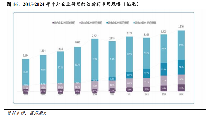 从国内市场来看,2015-2024年,受益于创新药获批数量增多、创新药临床价值提升以及医保政策等,国内创新药市场规模持续扩大,市场份额不断提升。2015-2024年,创新药在中国核心医院的市场规模由1374亿元增长至2576亿元,市场份额由21%提升至29%。其中,由中国企业研发的创新药占国内创新药市场的份额由18.7%提升至27.8%,实现对外资药企主导地位的实质性突破。2015年后上市的国产创新药表现尤为突出,在2024年贡献了11.3%的创新药市场份额,较2020年(3.2%)实现翻倍增长。从海外市场来看,凭借差异化且同类最佳的临床疗效、适应症持续拓展以及卓越的国际化销售能力等,以泽布替尼(百济神州)、CARVYKTI(传奇生物)为代表的国产创新药在海外市场呈现快速放量,并在相关疾病领域占据领先地位,为国产创新药出海树立标杆,同时打开国产创新药的销售空间。2025年1-9月,百济神州的泽布替尼实现销售收入199.50亿元,同比+53.95%,在全球BTK抑制剂同类药物的营收规模中居于首位;传奇生物的CARVYKTI实现销售收入13.32亿美元,同比+112.10%。