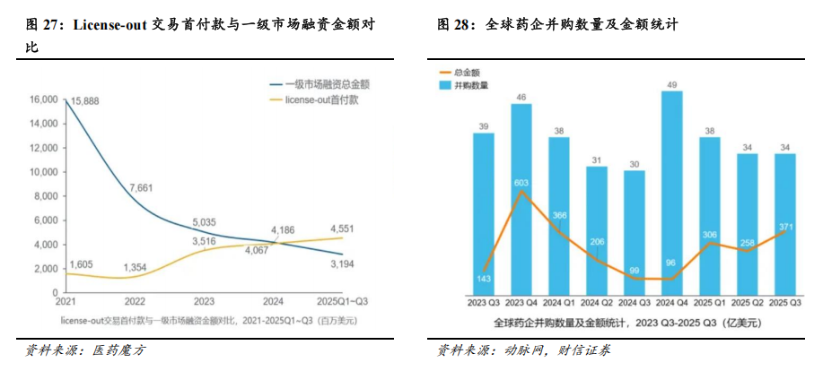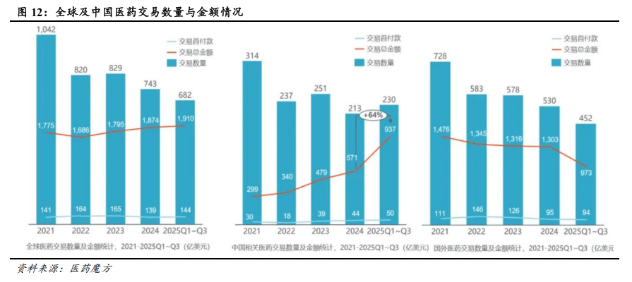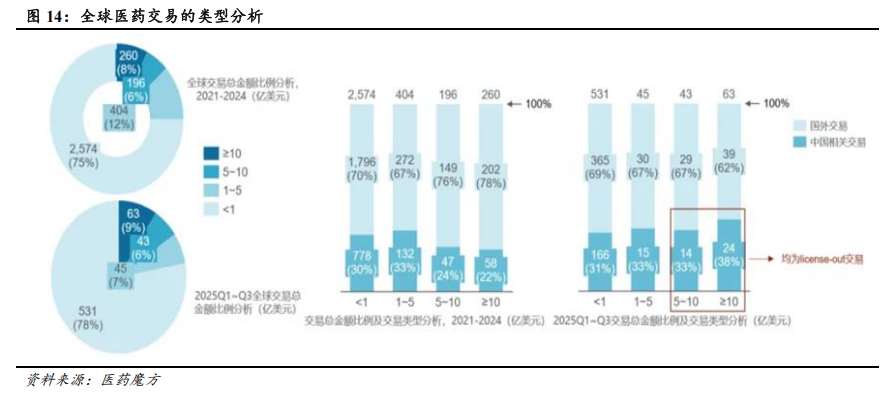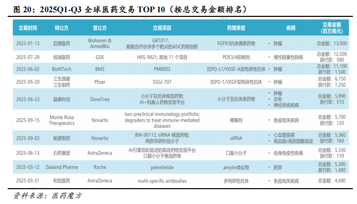 中国创新药BD有望持续活跃。2025年前三季度,全球医药交易数量与金额均呈现上升趋势,交易数量达682笔,交易首付款达144亿美元,交易总金额达1910亿美元,均已超过2024年全年水平。其中,中国相关医药交易总金额达937亿美元,与国外交易总金额相当,交易数量与金额均超越2024中国全年交易水平。从交易类型来看,2025年前三季度,全球重磅交易(单笔金额≥10亿美元)占比提升至9%,中国相关重磅交易占全球重磅交易总量的比重达到38%(2021-2024年该占比约为22%)。中国创新药的质量也获得全球TOP MNC(全球大药企)的认可。2025年前三季度,TOP MNC从中国引进交易数量占全球总数量的比重为20%,从中国引进交易总金额占全球总金额的比重为39%。TOP MNC主导的重磅交易中,约30%涉及中国资产,典型案例包括:恒瑞医药将PDE3/4抑制剂及11个项目授权给GSK,总金额达125亿美元,创下国内资产对外授权至MNC的历史新高;三生制药/三生国健与辉瑞达成的PD-1/VEGF双抗交易(交易总金额为60.50亿美金、首付款为12.50亿美金);信达生物与武田制药达成的PD-1/IL-2双抗及ADC药物交易(交易总金额为114亿美金、首付款为12亿美金)等。前述重磅交易充分彰显中国在双抗、ADC等前沿领域的研发实力。根据GeneOnline报道,2025年至2030年间,全球制药业将有高达2360亿美元的药品销售额面临专利到期风险,波及69款重磅药物,包括默沙东的K药、BMS的O药、再生元/拜耳的阿柏西普、礼来的度拉糖肽等明星产品。在全球制药业面临专利悬崖、中国创新药快速崛起的背景下,中国创新药有望依托效率优势、成本优势、差异化优势等,持续产生BD交易,兑现早期管线价值以及产品海外价值。