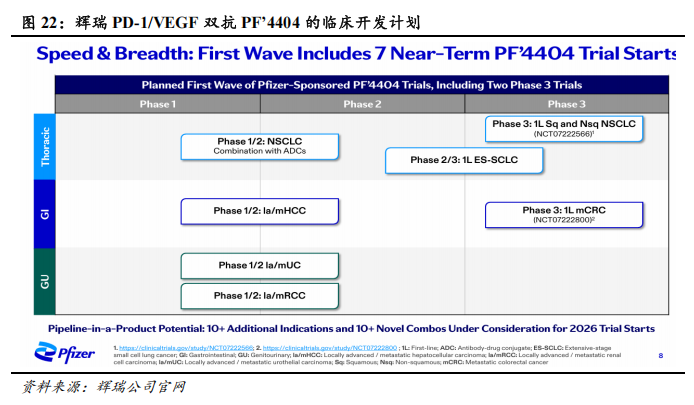 2025年5月20日,辉瑞以60.50亿美元的总交易价格(首付款为12.50亿美元)引进三生制药PD-1/VEGF双抗(SSGJ-707)。2025年11月10日,辉瑞举行PD-1/VEGF双抗(SSGJ-707/PF-08634404,以下简称“PF’4404”)的临床开发策略会议。会上,辉瑞表示,PF’4404是一种具有潜在变革性作用机制的双特异性抗体,是一项基础资产(foundational asset),与辉瑞的肿瘤学战略高度契合,可能成为多个癌种的基础疗法(foundational therapy)。辉瑞计划近期启动首批7项临床试验,包括两项III期临床研究(一线非小细胞肺癌和一线转移性结直肠癌),计划在2026年底前再启动10个以上新的适应症研究及10个或更多新型联合方案研究,包括与公司ADC产品的联用等。
