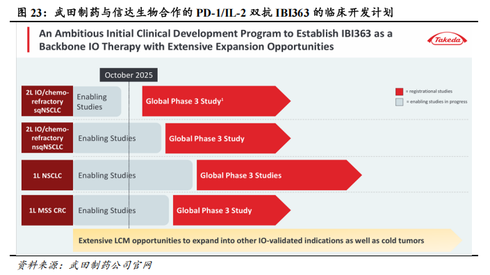 2025年10月22日,武田制药以114亿美金的总交易价格(首付款为12亿美金)与信达生物达成全球战略合作,旨在加速推进信达生物新一代免疫肿瘤学(IO)及抗体偶联药物(ADC)疗法的全球开发与商业化。本次合作主要涉及三款在研管线:①IBI363,一款处于III期临床研究阶段的全球首创PD-1/IL-2α-bias双特异性抗体融合蛋白,IBI363已在多项临床研究中展现出强劲广谱的抗肿瘤活性,有望成为新一代IO基石疗法;②IBI343,一款处于III期临床研究阶段的同类最优CLDN18.2 ADC;③IBI3001,一款处于I期临床研究阶段的全球首创的EGFR/B7H3双抗ADC。其中,武田制药将IBI363确立为具有广泛扩展机会的基础免疫肿瘤(IO)疗法,明确IBI363全球III期开发计划包括二线治疗sqNSCLC、二线治疗nsqNSCLC、一线治疗NSCLC、一线治疗MSS CRC等,并预计IBI363的潜在市场空间可达400亿美金。