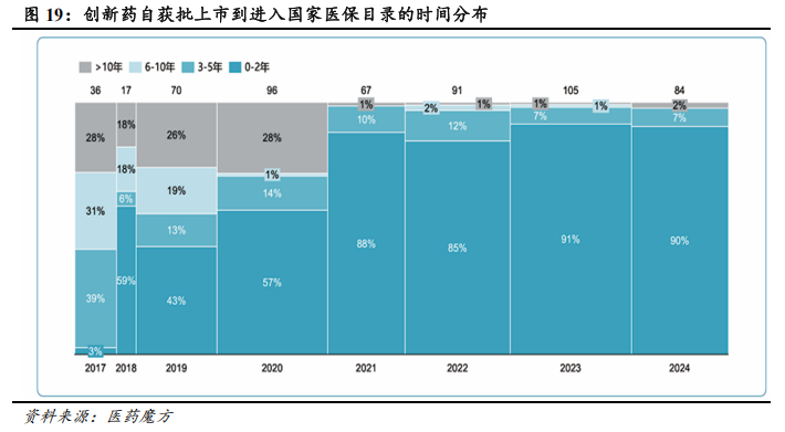 伴随着国家医保谈判常态化、谈判续约规则日益完善,创新药上市后纳入国家医保目录的时间明显缩短。在2021-2024年成功纳入国家医保目录的药品中,约90%的药品在获批上市2年内即纳入国家医保目录,极大地促进了国内创新药的销售放量。2025年7月,国家医保局、国家卫生健康委发布《支持创新药高质量发展的若干措施》。《措施》明确提出,要增设商业健康保险创新药品目录,重点纳入创新程度高、临床价值大、患者获益显著且超出基本医保保障范围的创新药。中再寿险联合镁信健康、波士顿咨询发布的《中国创新药械多元支付白皮书(2025)》显示,2024年,在我国创新药械支付中,医保基金支付占44%,个人自费占49%,商保支付占比仅约7.7%,距离“商保补充医保”的定位仍有巨大差距。商保创新药目录的推出,将有助于完善国内创新药的支付环境,赋能国产创新药发展。