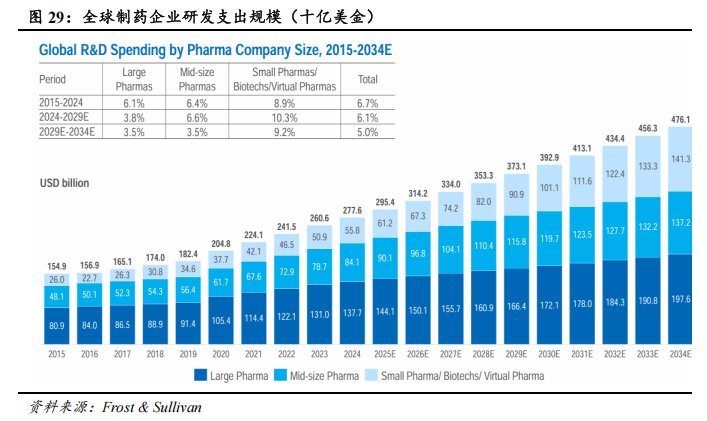 医疗健康领域融资同比改善,对外授权及并购交易活跃。根据动脉网的统计数据,2025年1-10月,全球医疗健康领域融资总额(不包括IPO、定向增发,下同)约为549.55亿美元,同比增长8.32%。其中,国内、国外医疗健康领域融资总额分别为74.29、475.26亿美元,同比增长17.73%、6.98%。根据医药魔方的统计数据,2025年前三季度,全球及中国医药交易在数量及金额上均呈现上升趋势,均已超2024年全年水平。活跃的医药交易正为医药研发需求注入强劲增长动力。一方面首付款为Biotech企业提供研发资金,另一方面有助于早期研发管线提前兑现价值,激发研发热情及投资积极性。以中国市场为例,2025年前三季度,中国License-out交易首付款达45.5亿美元,相较一级市场融资总额已多出13.5亿美元,成为Biotech等企业重要的资金回笼渠道。此外,2025年前三季度,全球药企并购活跃,合计并购数量达106起,同比增长7.07%;并购金额达935亿美金,同比增长39.34%。展望未来,全球医药研发支出将有望保持稳健增长。根据Frost & Sullivan的统计及预测,2024-2029年,全球制药企业的研发支出有望保持6.10%的复合增速。
