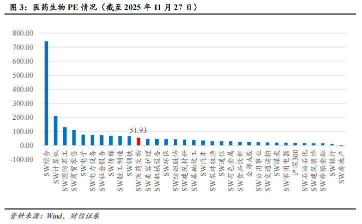 横向比较:截至2025年11月27日,医药生物板块PE(TTM,整体法)均值为51.93倍,在申万31个一级行业中排名第11位,相对沪深300的溢价率为272.26%,相对全部A股(非银行)的溢价率为68.93%。纵向比较:按日取值,医药生物板块PE位于自2016年以来83.10%分位数,处于历史偏高水平;医药生物板块PE相对沪深300、全部A股(非银行)的溢价率分别位于自2016年以来78.50%、79.60%的分位数。