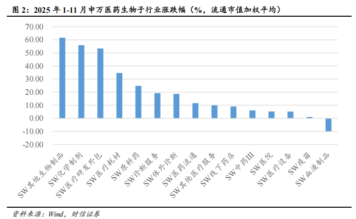 2025年1-11月(统计期间为1月1日至11月27日),医药生物(申万)板块涨幅(流通市值加权平均)为31.51%,在申万31个一级行业(2021年行业分类)排名12位,跑赢沪深300指数1.91个百分点。分子行业来看,其他生物制品、化学制剂、医疗研发外包板块涨幅靠前,分别上涨61.59%、55.87%、53.42%,医疗设备、疫苗、血液制品板块涨幅靠后,涨跌幅分别为+5.15%、+1.05%、-9.97%。