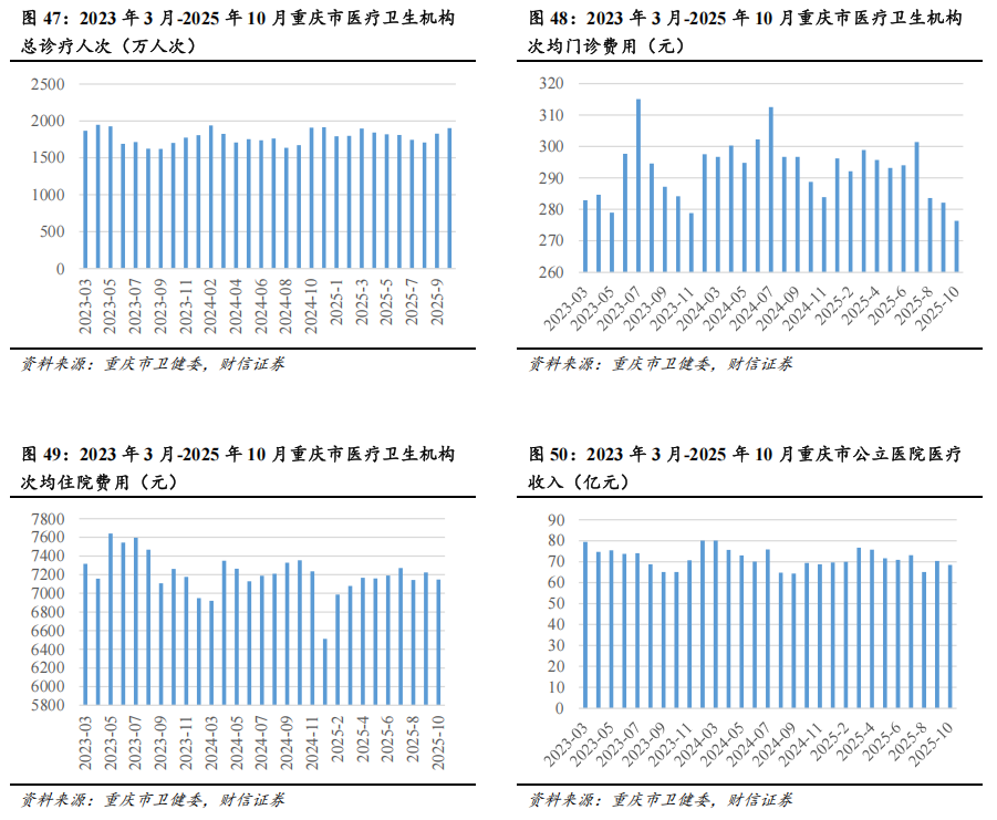 在DRG支付改革持续深入、医疗反腐常态化、医疗服务价格调整持续推进、医疗消费需求偏弱、行业竞争加剧等综合影响下,国内医疗服务行业经营情况短期承压。从重庆市医疗卫生机构运行情况来看,2025年1-10月,重庆市医疗卫生机构总诊疗人次达18134.99万人次,同比增长2.19%;重庆市医疗卫生机构次均门诊费用、次均住院费用分别为291.25、7081.67元,同比下降2.01%、0.54%;重庆市公立医院医疗收入达711.39亿元,同比下降1.30%。从医疗服务上市公司经营情况来看,医疗服务上市公司整体经营业绩增长承压,仅有部分品牌及管理优势明显的消费医疗企业(如爱尔眼科、通策医疗等)实现正增长。2025年以来,政府出台系列促进消费的政策,伴随着政策落地显现,国内消费意愿有望增强,医疗消费需求有望改善,建议关注具备品牌与管理优势、差异化服务能力强的医疗服务企业,如爱尔眼科、通策医疗等。