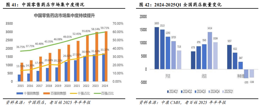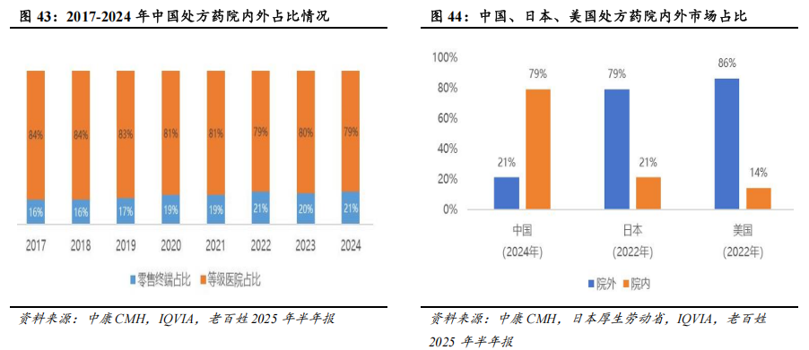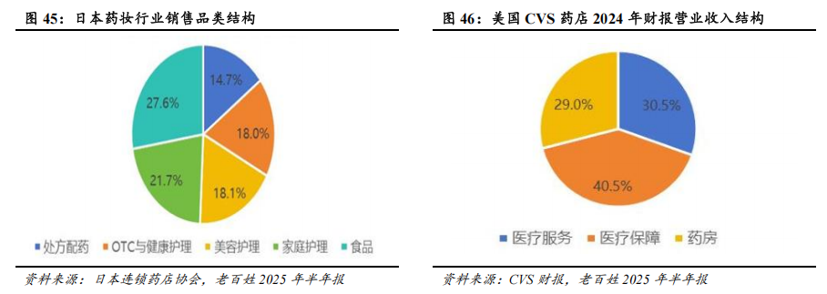 集中度提升、处方外流、非药品业务扩张的长期增长逻辑没有变。我国零售药店行业集中度呈现持续提升的趋势,但与美日等发达国家相比,仍有较大提升空间。当前,我国零售药店行业合规化进程呈加速趋势,药品比价政策、飞行检查常态化、药品溯源码上线、药店药师“挂证”核查等监管政策相继出台,对零售药店的合规性提出更高的要求。此外,自2024Q4以来,受行业政策、医药消费偏弱、行业竞争激烈等因素影响,零售药店行业进入出清阶段,全国医药零售门店数量呈现减少趋势。2024Q4、2025Q1,全国医药零售门店数量分别减少3395、3166家。在前述背景下,大型连锁药店的合规运营、精细管理、选品与服务、资金优势进一步凸显,行业集中度有望向头部企业集中。处方外流方面,2017-2024年,我国零售终端在处方药销售中的占比由16%逐渐提升至21%,但与发达国家相比,我国处方药院外销售占比仍存在较大的提升空间。日本、美国的处方药院外销售占比在2022年已分别达到79%和86%,而我国2024年处方药院外销售占比仅为21%。门诊统筹政策、电子处方流转平台完善、药店合规化水平提升等有望推动院内处方外流。在非药品业务扩张方面,2024年11月,商务部等七部门关于印发《零售业创新提升工程实施方案》指出,允许零售药店依法开展非药商品销售及相关健康服务,鼓励药店多元化发展。2024年,我国零售药店的非药类销售占比仅为18.6%,同美日等国家存在显著差异。我国药店在商品及服务多元化方面具有较大的发展空间,头部企业正积极拓展非药品业务。例如,2025年,一心堂全新打造非药业务板块,涵盖保健食品、医疗器械、泛健康三大核心品类。其中,泛健康品类包括美妆、个护、母婴、潮玩等,美妆、个护、家清、潮玩为核心增长点,2025年前三季度保持高双位数增长,为公司业绩贡献增量。截至2025年9月,一心堂已完成805家门店的调改升级。